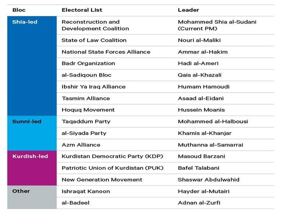 من التحالف العراقي الموحد (UIA) ظهرت الآن العديد من الفصائل الشيعية المتنافسة، وتشمل تحالف إعادة الإعمار والتنمية بقيادة رئيس الوزراء السوداني، دولة القانون بقيادة رئيس الوزراء السابق نوري المالكي ،الصادقون بقيادة قيس الخزعلي ،بدر بقيادة هادي العامري، تحالف القوات الوطنية بقيادة عمار الحكيم، ولدى بعض هذه الجماعات، بدرجات متفاوتة، روابط تاريخية وسياسية مع إيران. الأحزاب الشيعية الآن منقسمة ضمن الاطار التنسيقي (SCF) الذي من المتوقع أن يتوحد بعد الانتخابات، في حين يقاطع مقتدى الصدر الانتخابات. الأكراد يخوضون الانتخابات من خلال أحزاب منفصلة مثل KDP وPUK وحركات أصغر، بينما ظهرت عدة أحزاب سنية جديدة أبرزها تقدم، السيادة، وتحالف عزم.