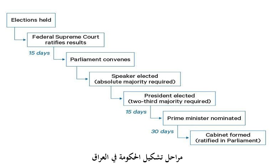 نظريًا، يحدد دستور العراق جدولًا زمنيًا واضحًا لتشكيل الحكومة بعد الانتخابات. عمليًا، تصبح كل خطوة فرصة للكتل السياسية للحصول على تنازلات، وتبادل المناصب، وتعزيز الاتفاق النخبوي الذي يقوم عليه النظام نفسه. منذ عام 2005، بلغ متوسط الفترة بين التصويت وتشكيل الحكومة حوالي 224 يومًا. ويتم تخصيص المناصب الوزارية والمناصب العليا وفقًا لـ “نظام نقاط” غير رسمي، يتم تعديله بناءً على عدد المقاعد التي يحصل عليها كل حزب.